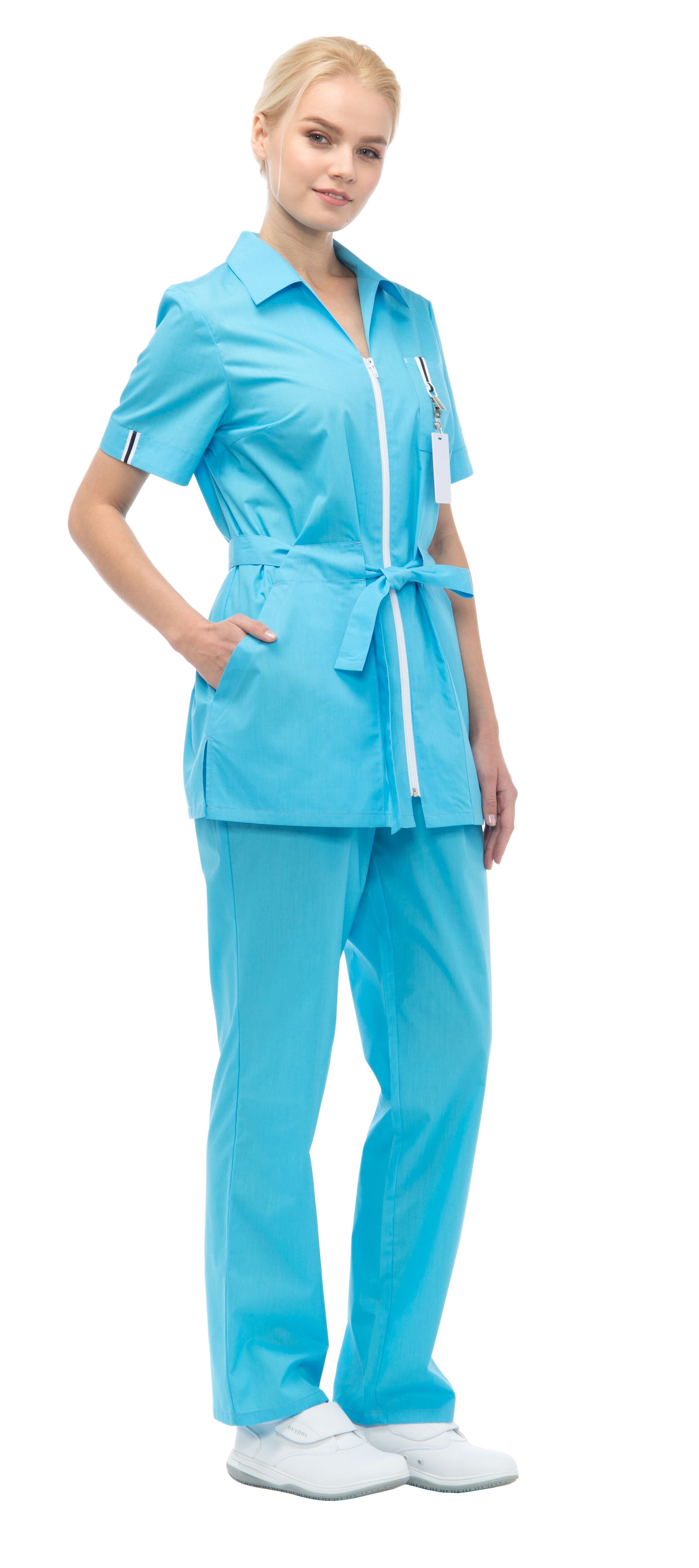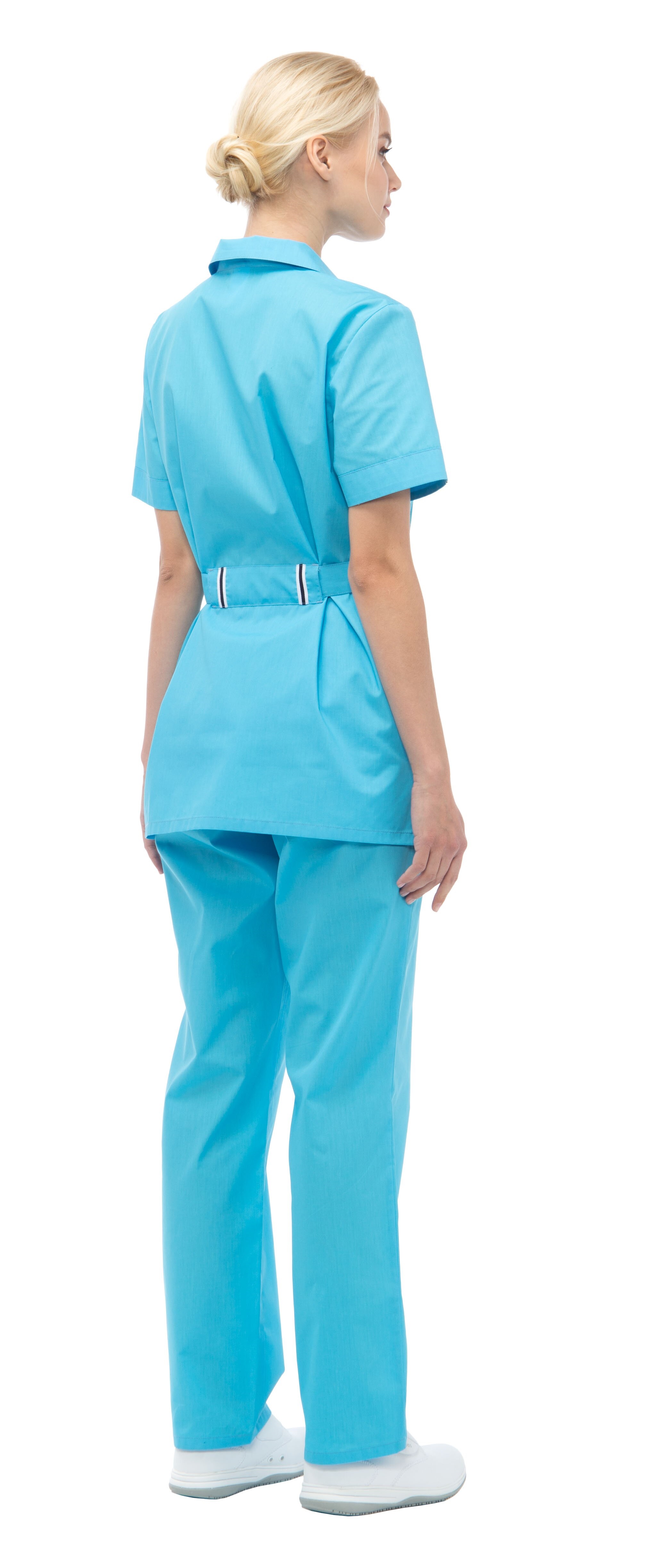 Комплект из блузы и брюк. Блуза удлиненная прямого силуэта, с застежкой на молнию и поясом по талии. Воротник отложной. Нагрудный карман с тесьмой и кольцом для крепления бейджа. Нижние накладные карманы со шлевками для пояса. На спинке длинная шлевка для крепления пояса. Втачные короткие рукава с декоративным отворотом. По низу блузы, по боковым швам, небольшие разрезы. Брюки прямого силуэта с эластичным поясом по талии.
