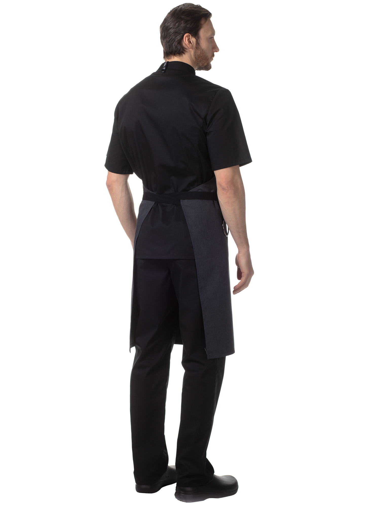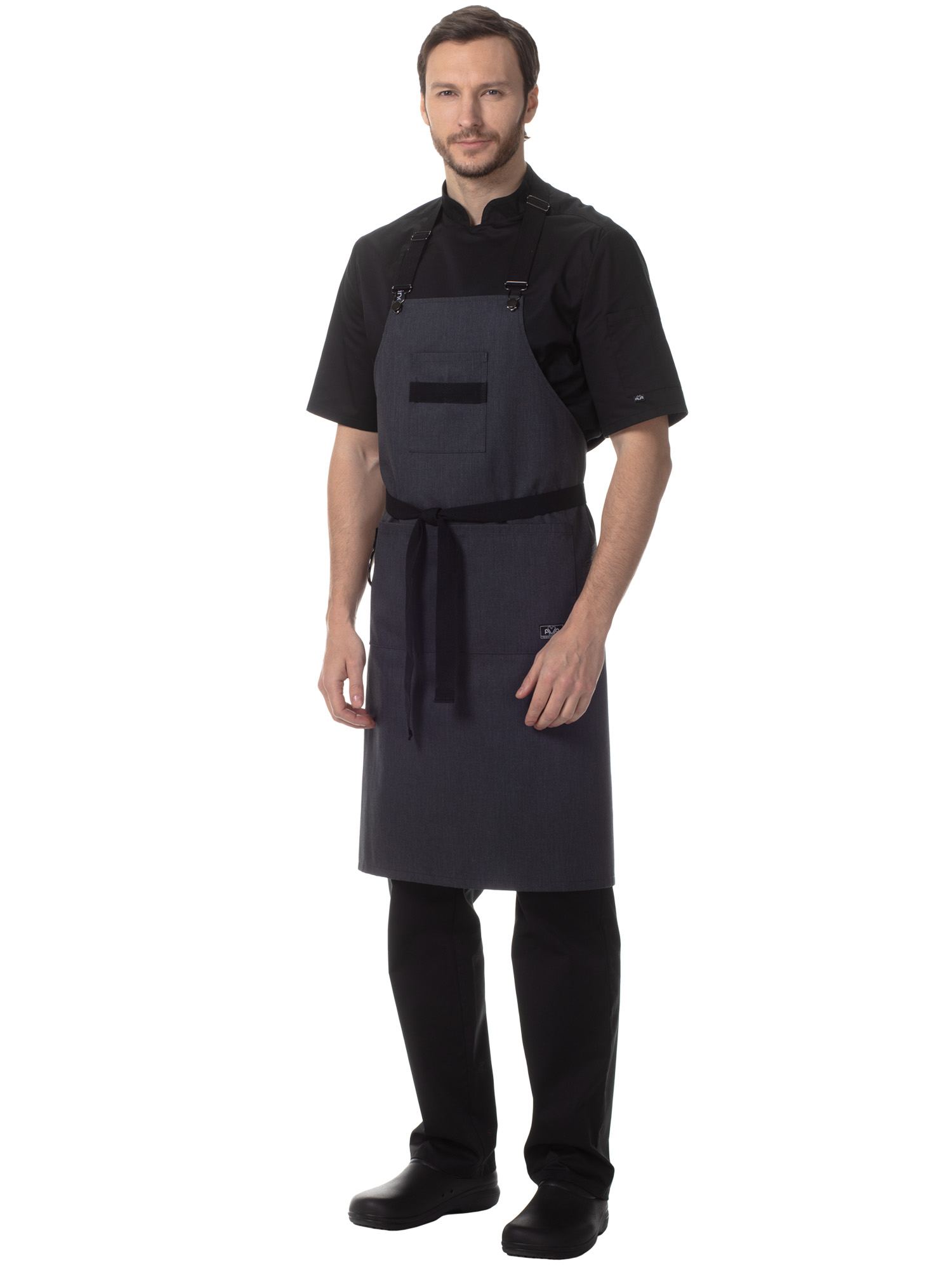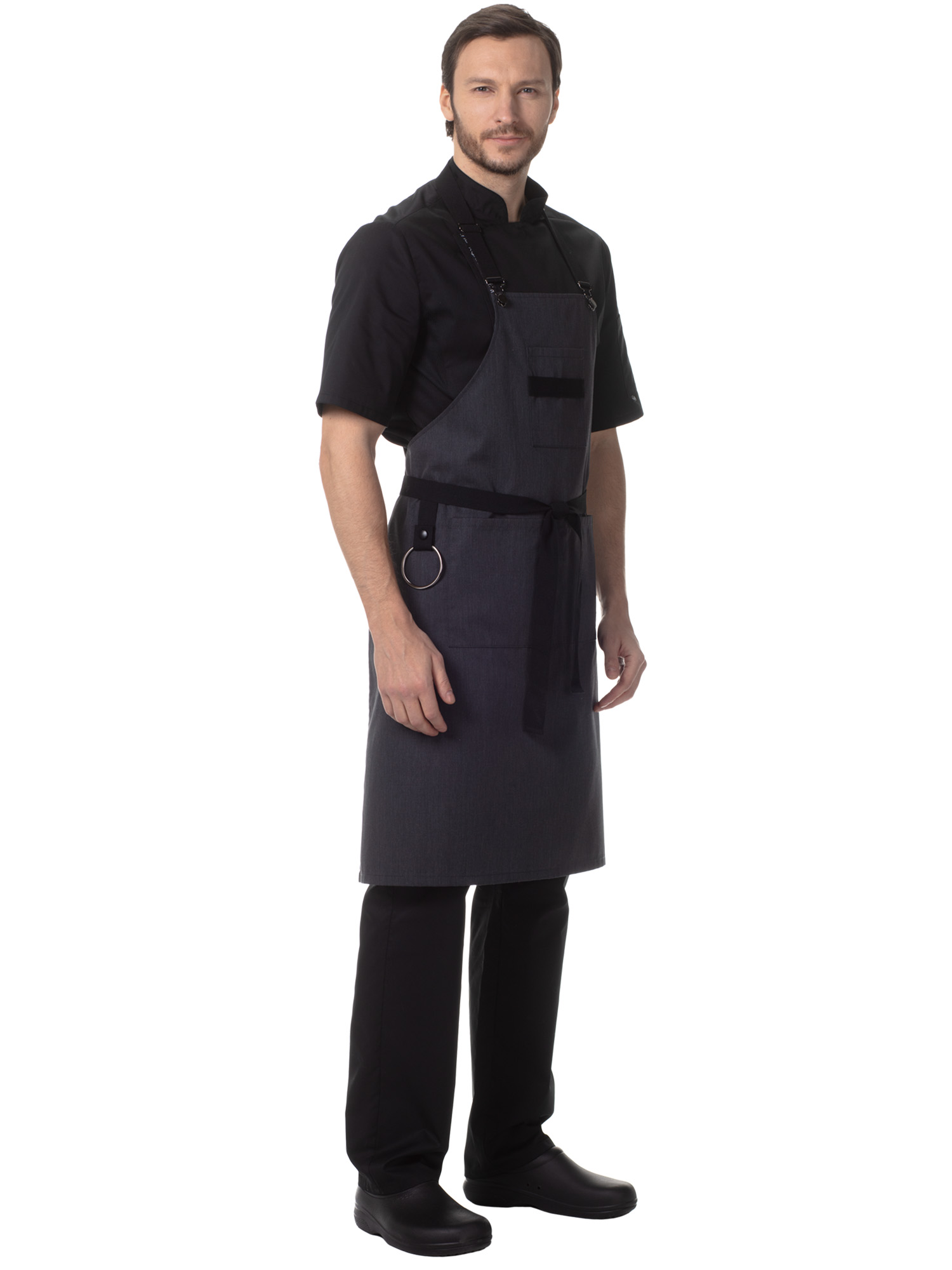 Фартук средней длины, с грудкой. Вокруг шеи съёмная бретель из тесьмы с регулировкой по длине, пристёгивается к грудке на металлические пуговицы пряжками. По бокам полупояса из тесьмы. На уровне груди накладной карман с 2-мя шлёвками из тесьмы для фиксации пинцетов, щипцов и т.д. На уровне бедер большой накладной карман с 2-мя отделениями и петля с металлическим кольцом для полотенца. Предусмотрена возможность снять кольцо для стирки изделия.Ткань Томбой с с отделкой Easy Care, Carrington (Англия).