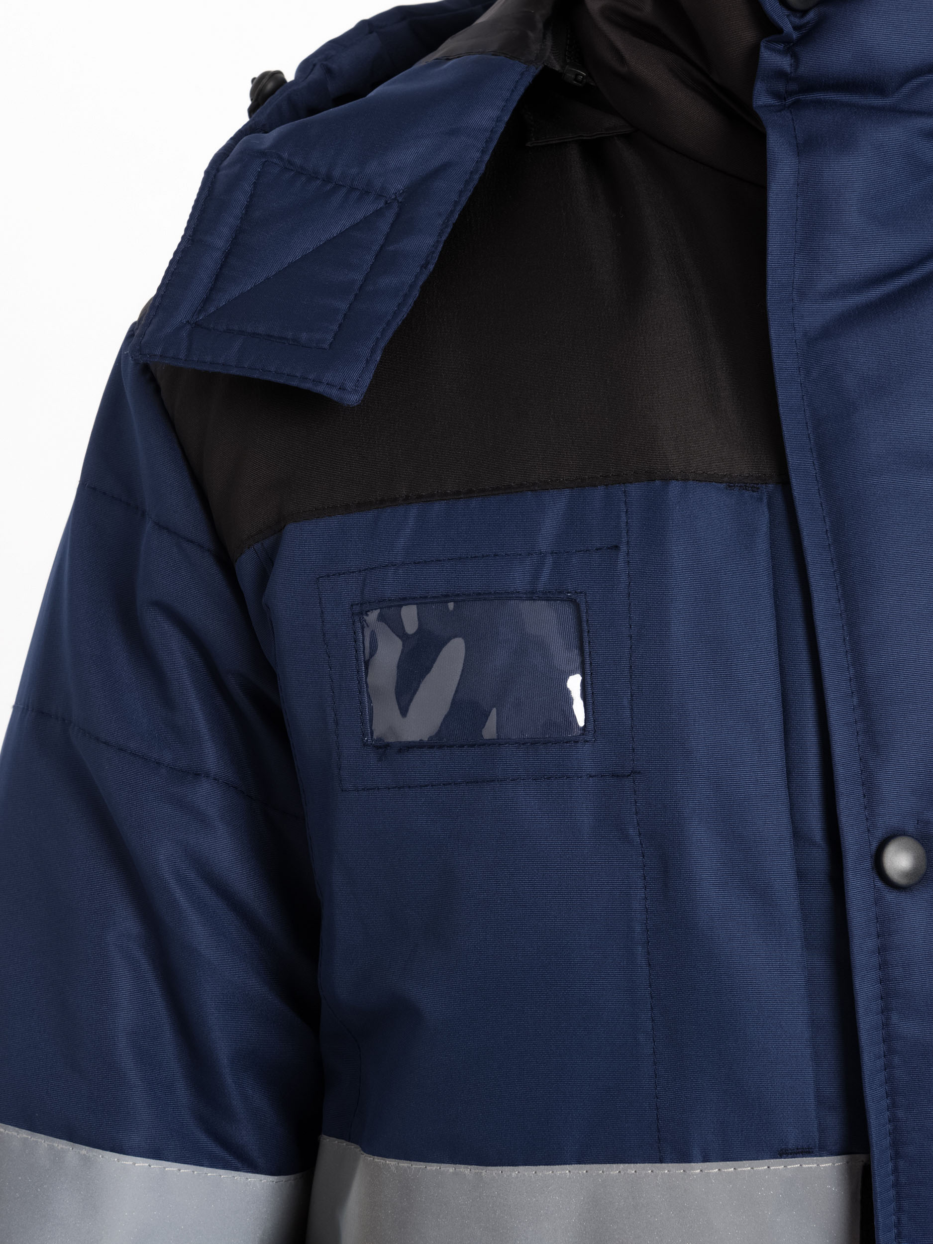 На правой стороне куртки расположен карман для бейджа с прозрачной защитной пленкой, что удобно для работы.