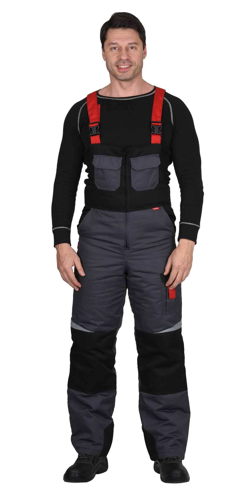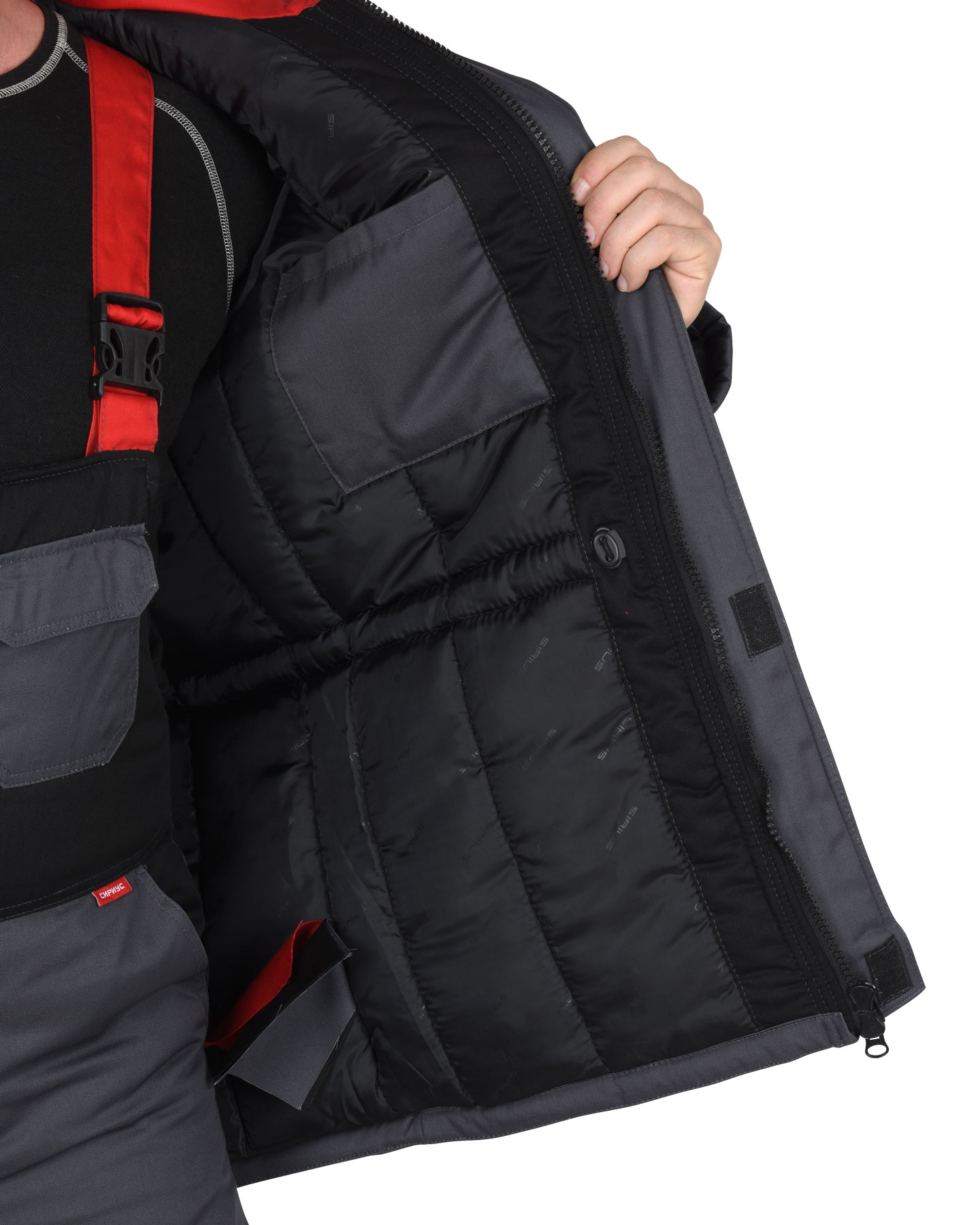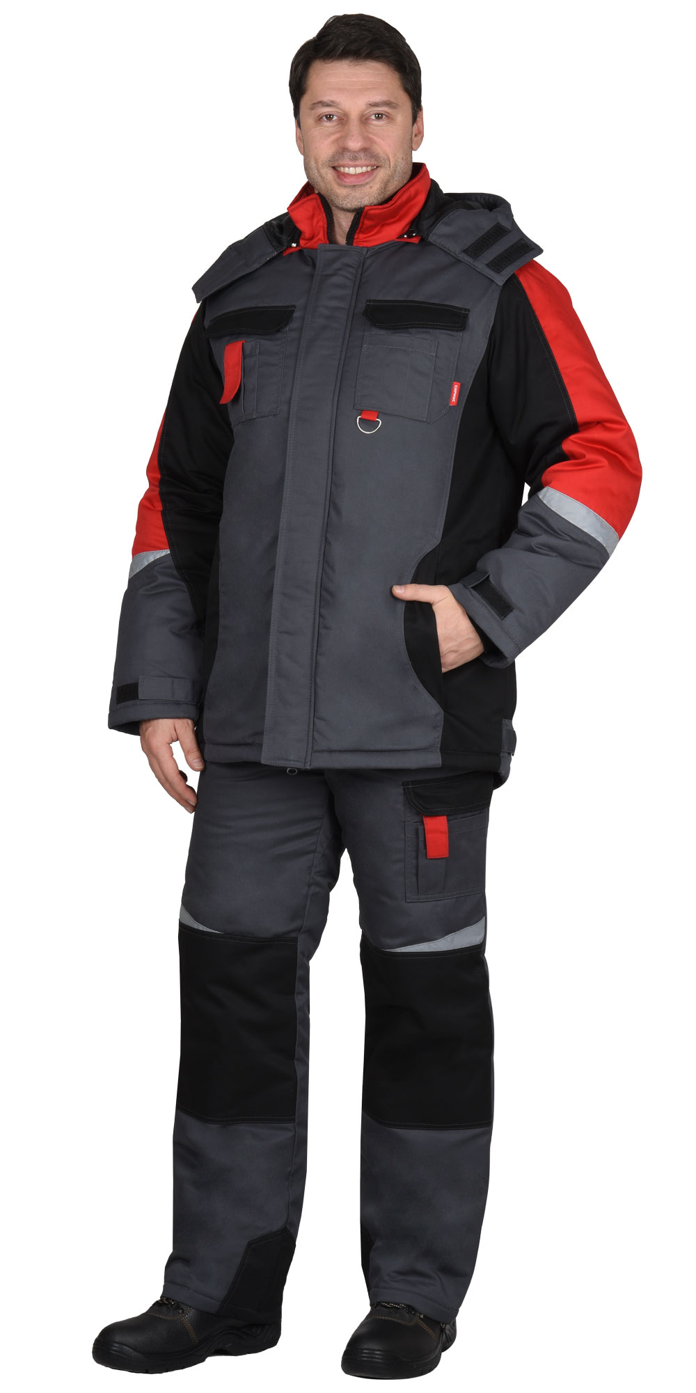 Зимний костюм "СИРИУС-ФАВОРИТ-МЕГА" мужской, утепленный (куртка и п/к), т.-серый с черным и красным