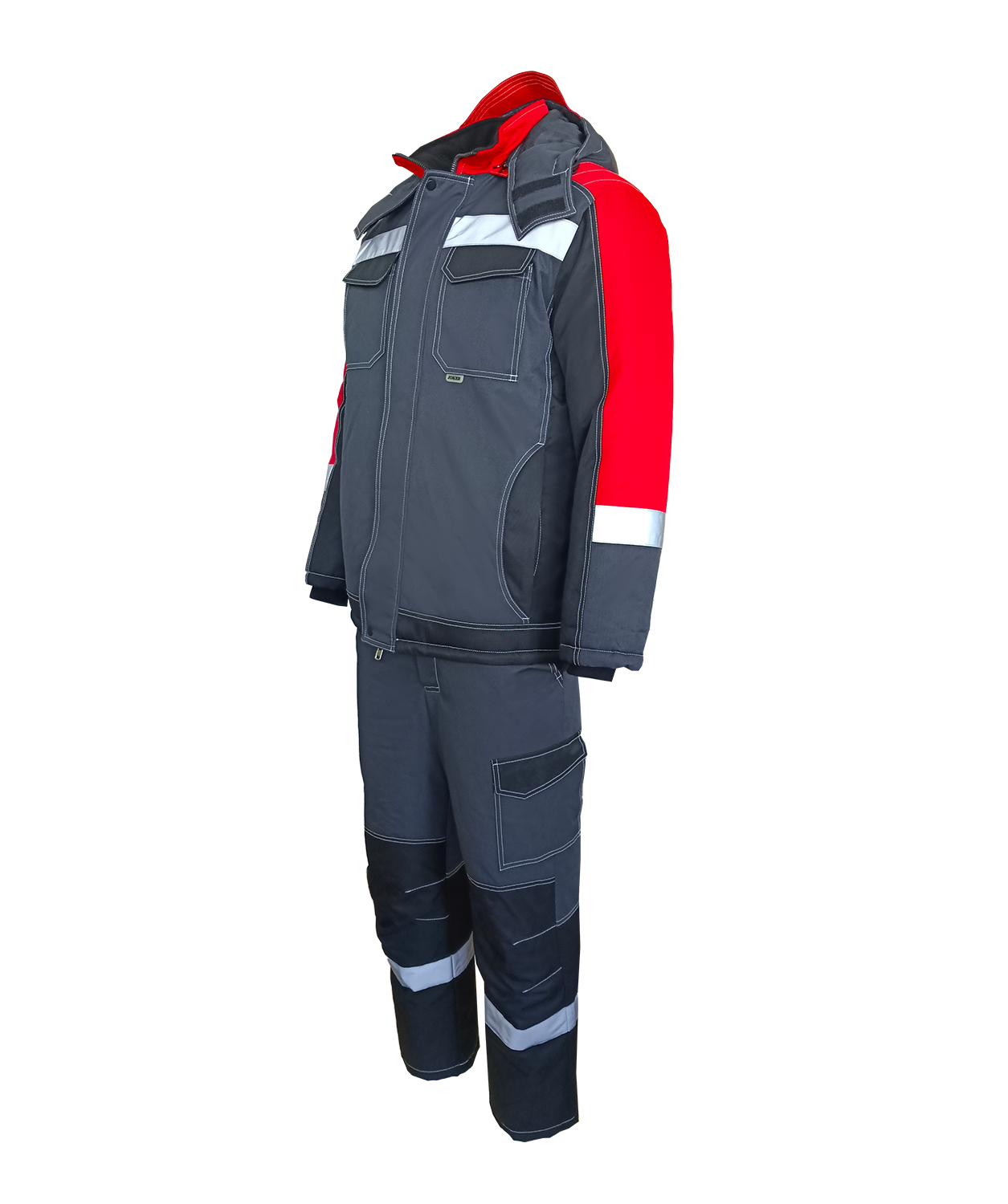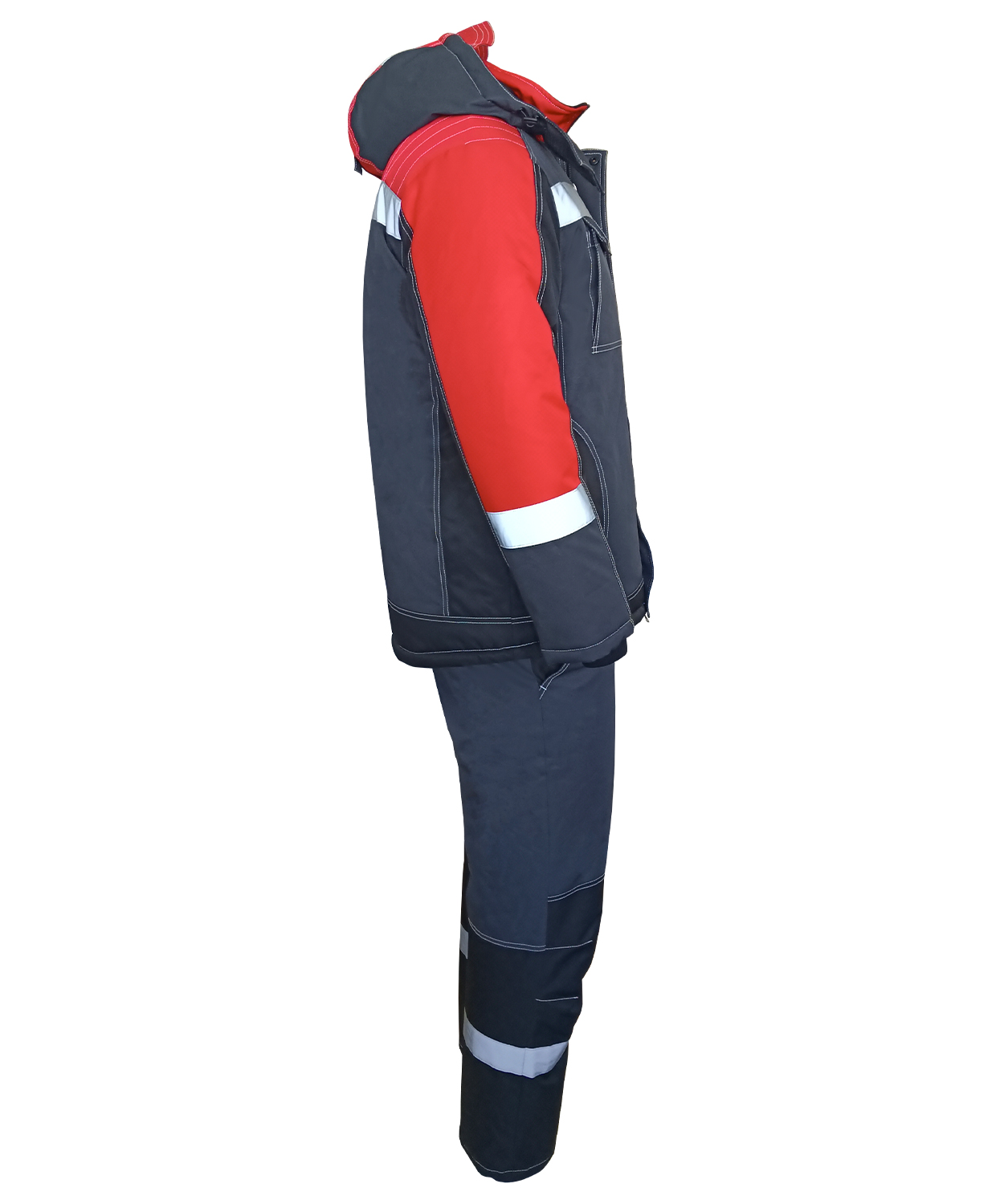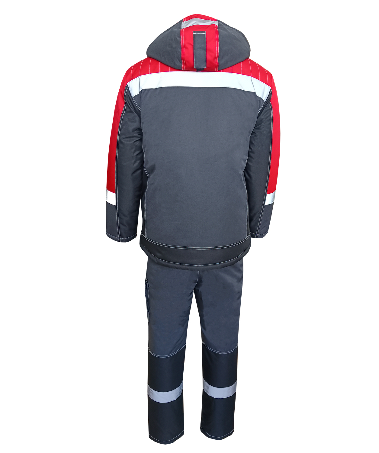 Зимний рабочий костюм "ЮКОН-Мембрана" для мужчин представляет собой идеальное решение для тех, кто работает в холодных условиях. Этот комплект, состоящий из куртки и брюк, выполнен в стильной комбинации серого, черного и красного цветов, что делает его не только функциональным, но и привлекательным.